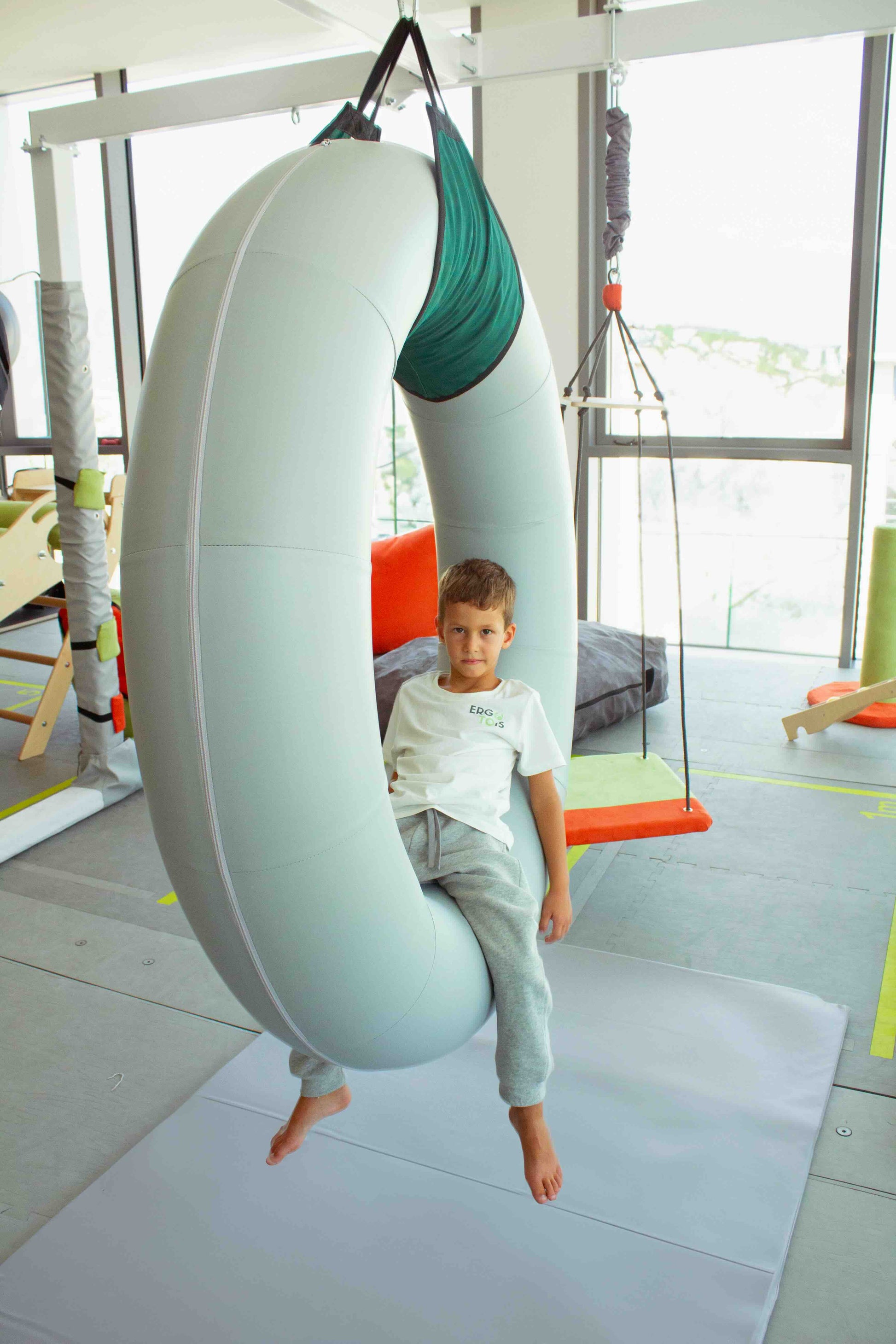Die Donut Schaukel ist ein Therapiegerät, welches speziell entwickelt wurde, um ein bereichertes Sinneserlebnis zu bieten. Geleitet von dem Wunsch, ein vollständiges Eintauchen in propriozeptive und vestibuläre System zu fördern, ist diese Schaukel ein unverzichtbares Gerät für eine Therapie, die auf den Prinzipien der sensorischen Integration basiert.