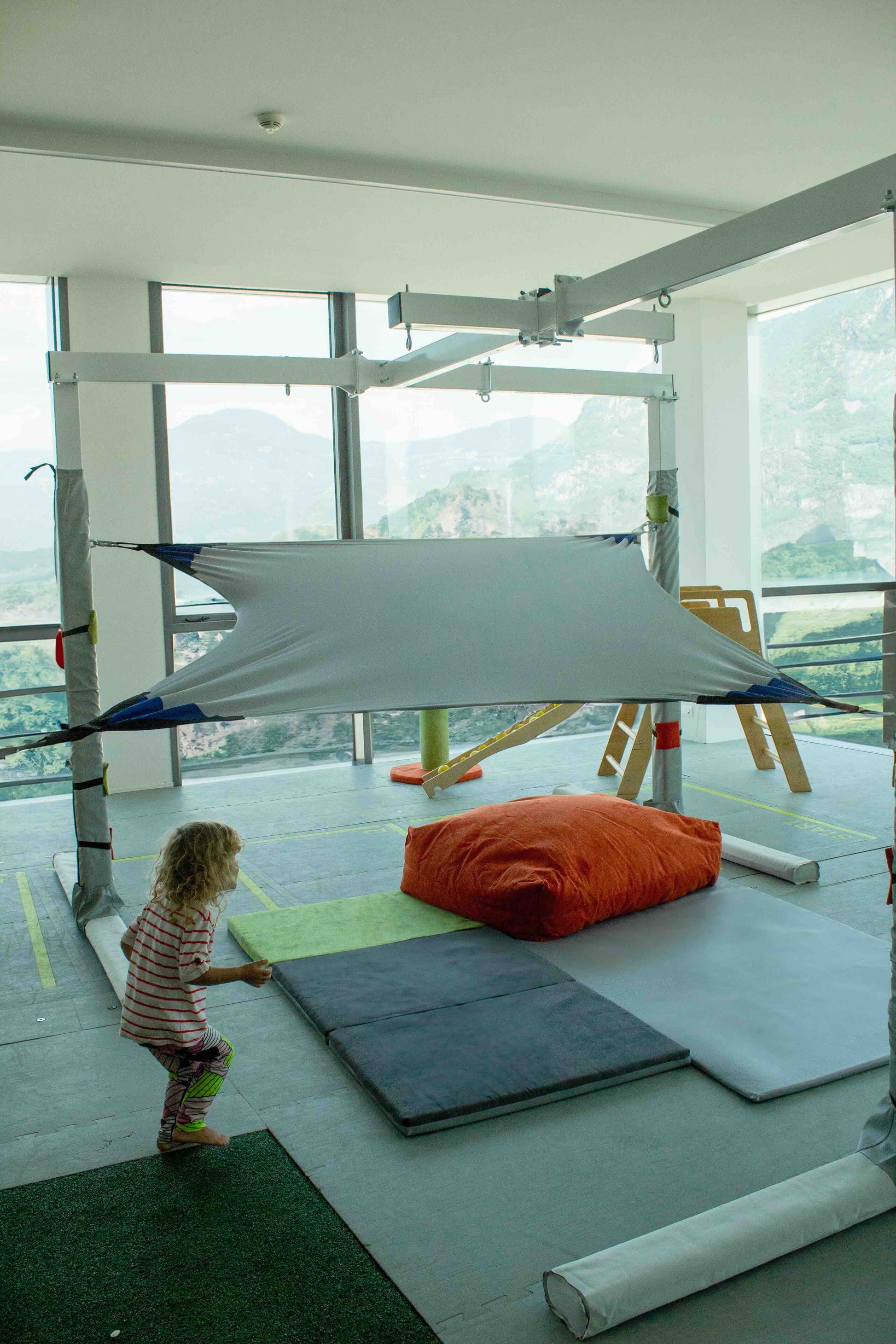 Die Vierpunktbefestigung sorgt für zusätzliche Herausforderung und ermöglicht Bewegungen wie Klettern entlang des Gummibands. Durch diese Anordnung kann auch ein entspannender, zeltartiger Raum geschaffen werden, der verschiedene Nutzungsmöglichkeiten bietet. Die Gummiband-Schaukel eignet sich besonders zur Entwicklung des Körperbewusstseins und zur Verfeinerung der motorischen Planungsfähigkeiten.