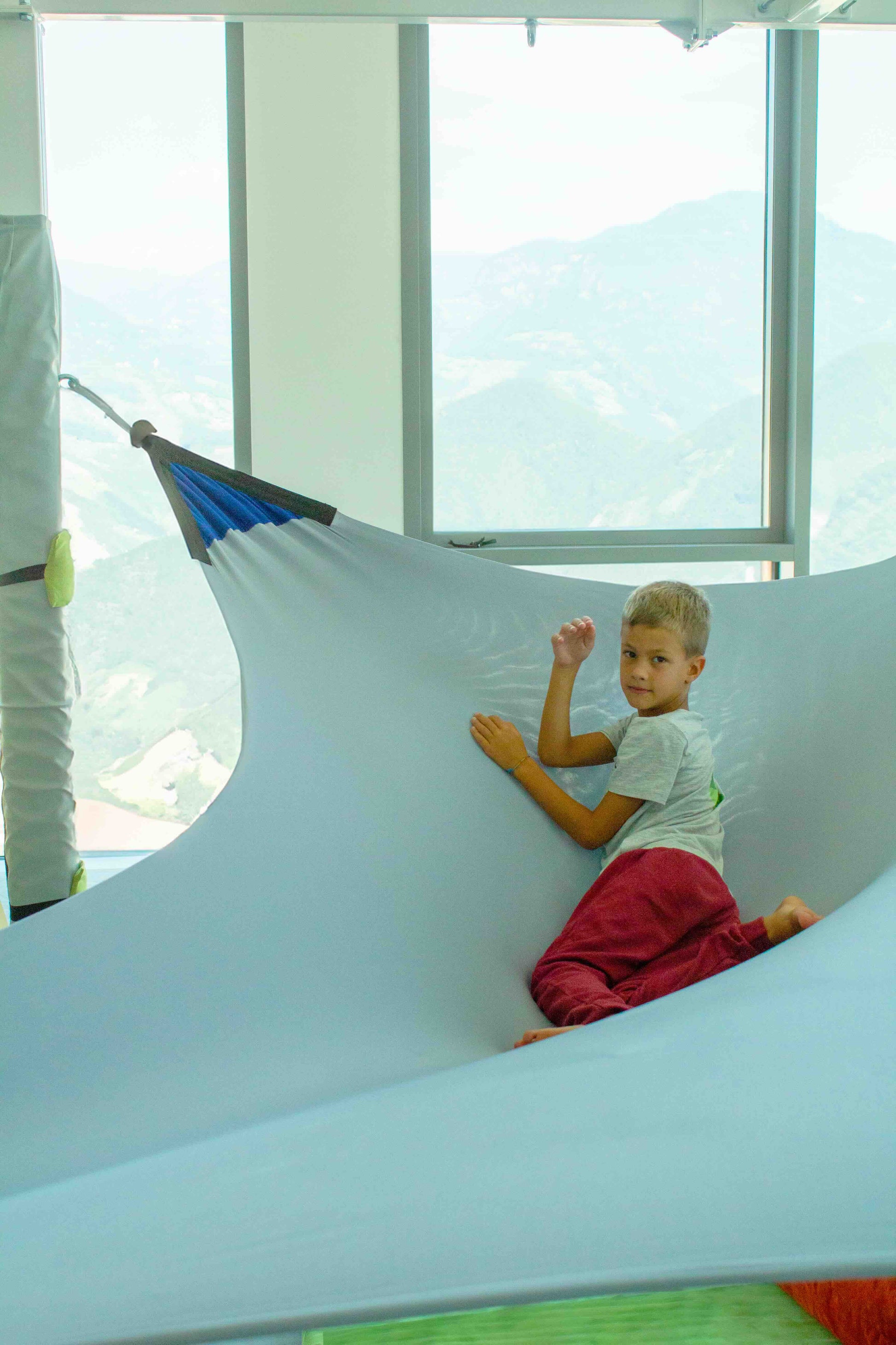 Diese Schaukel besteht aus einer einzigen Lage doppellagigem Vier-Wege-Stretch-Stoff und bietet gleichzeitig Widerstandsfähigkeit und Elastizität. Seine Struktur ermöglicht unterschiedliche Konfigurationen und ermöglicht die Verwendung mehrerer Gummibandschaukeln, um eine mehrschichtige Hängevorrichtung zu schaffen. Diese Option stellt vielfältige motorische Herausforderungen dar und ermutigt die Person, sich durch die verschiedenen schwebenden Schichten zu bewegen.