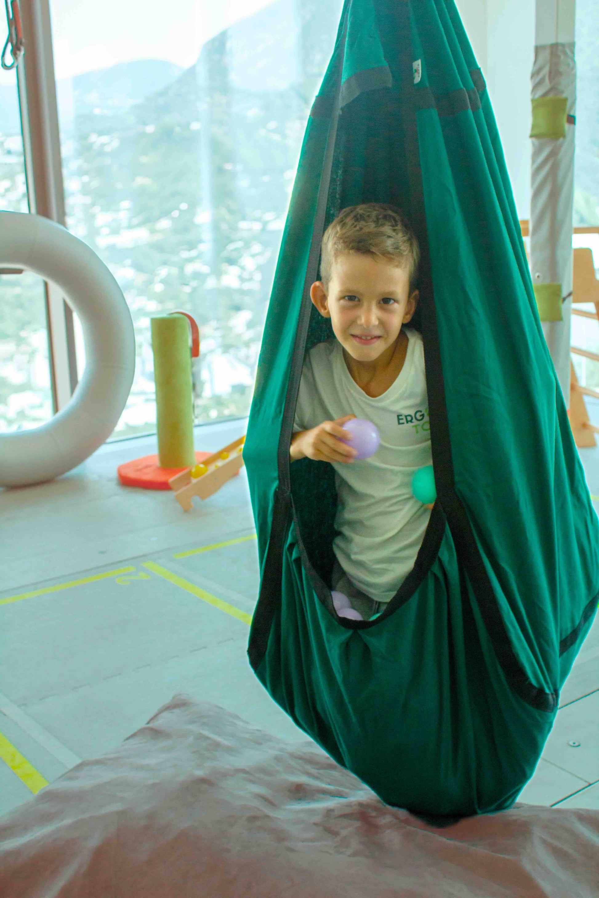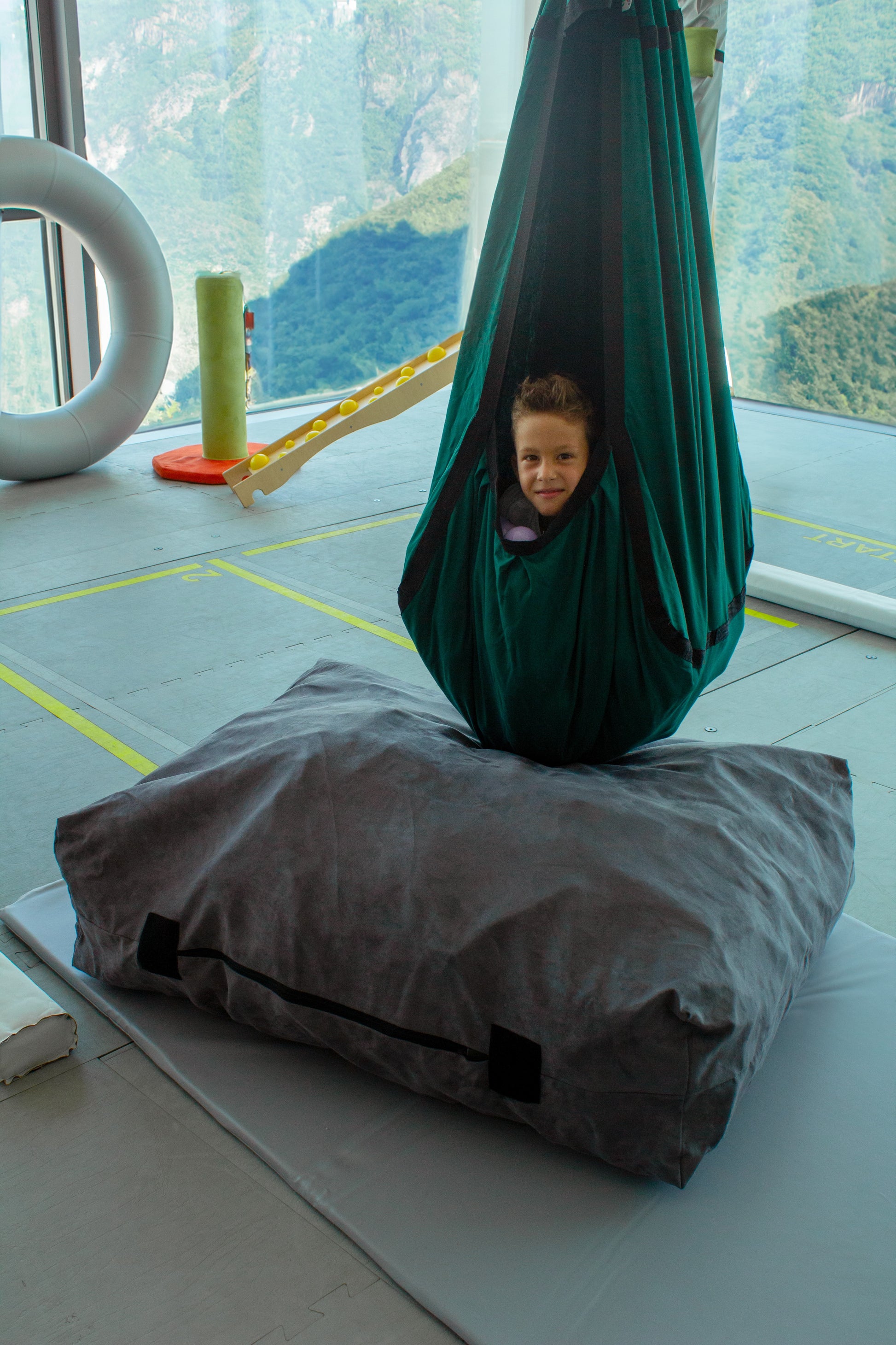 Diese Schaukel soll die gebeugte Position fördern und so eine sichere und komfortable Umgebung schaffen. Die Weichheit der Nido-Schaukel schafft einen umhüllenden, dunklen Ort und maximiert die sensorischen Vorteile der Tiefenwahrnehmung und der Gleichgewichtsstimulation. Ein einladender Rückzugsort, der nicht nur Spaß, sondern auch Wohlbefinden durch ein einzigartiges und therapeutisches Sinneserlebnis fördert.