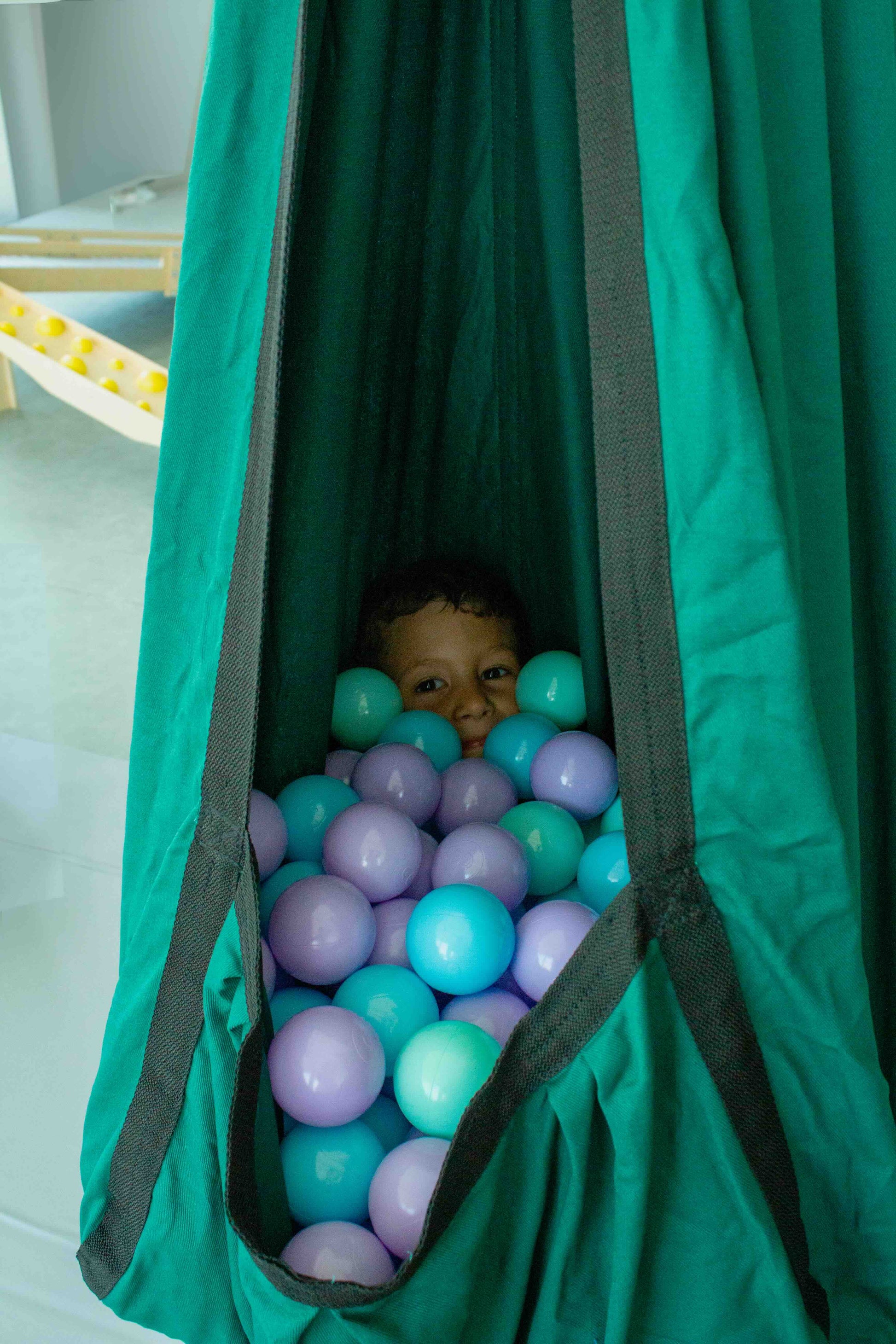 Die Nestschaukel mit Bällen ist ein umhüllendes Sinneserlebnis, das an einem Hakenpunkt hängt und durch das Vorhandensein von 250 pastellfarbenen Bällen bereichert wird. Dieses innovative Design sorgt nicht nur für spaßige Momente, sondern betont auch das Sinneserlebnis durch eine beruhigende Wirkung und die organisierende Kraft der Bälle. Die Nestschaukel stimuliert die Person durch tiefe taktile Druckeingabe und reichhaltige Vestibularstimulation und trägt so zur Steigerung der Körperwahrnehmung bei.