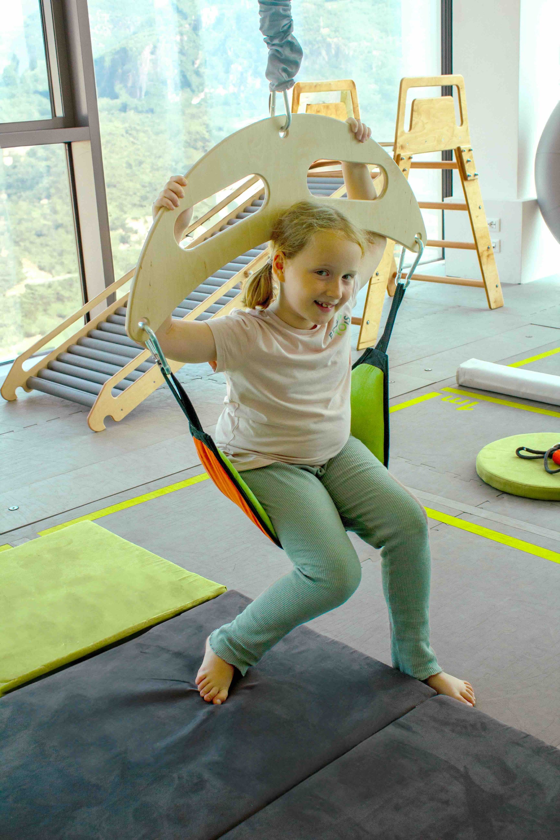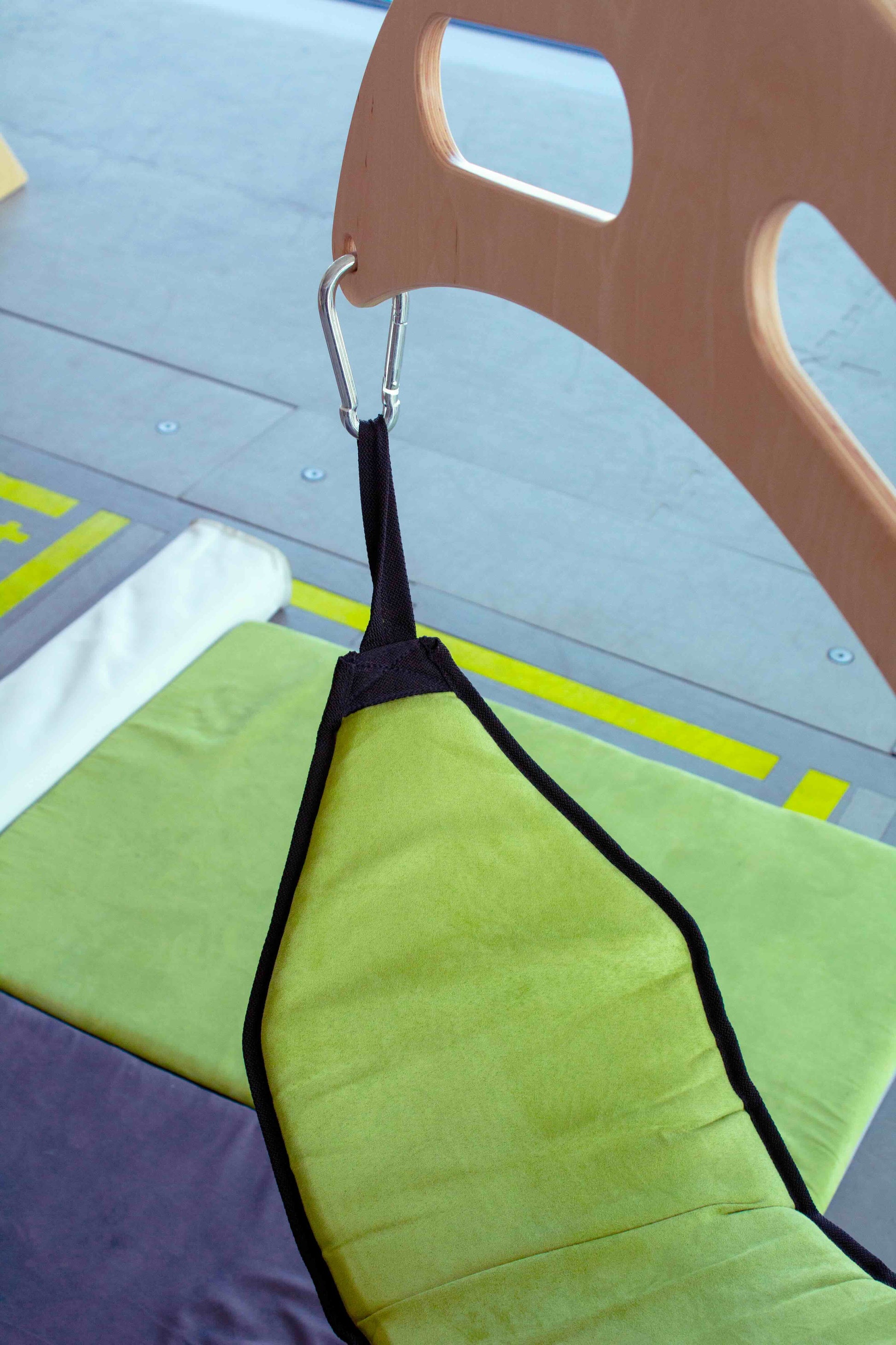 Die Froschschaukel ist ein Therapiegerät, das häufig in sensorischen Integrationstherapieeinheiten eingesetzt wird und eine breite Palette fortgeschrittener sensorisch angereicherter Übungen bietet. Diese Ausrüstung macht Therapiesitzungen spannend und anregend und bietet einen weichen Sitz für maximalen Komfort bei Aktivitäten unterwegs. Das Vorhandensein einer speziellen Feder, Bungee genannt, ermöglicht vertikale Vestibularbewegungen, die es der Person ermöglichen, wie ein Frosch zu springen und sich zu bewegen, wodurch ein unterhaltsames und interaktives Sinneserlebnis entsteht.