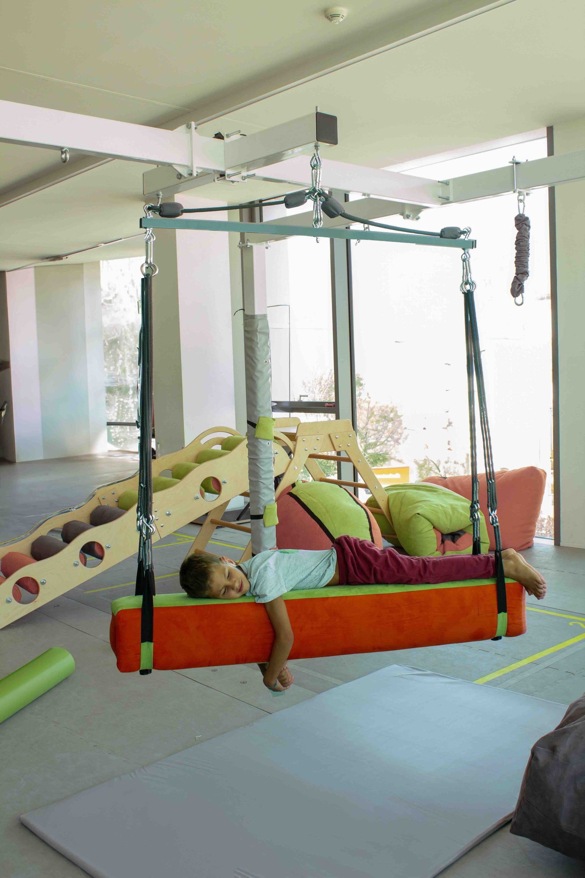 Seine Vielseitigkeit ermöglicht es dem Therapeuten, auf Menschen unterschiedlicher Größe und Körperhaltung einzugehen und so die Entwicklung auf individuelle Weise zu erleichtern. Durch die Robustheit der Balkenschaukel ist sie in der Lage, das Gewicht des Therapeuten zu tragen, was eine praktische Erleichterung während der Therapiesitzungen ermöglicht.