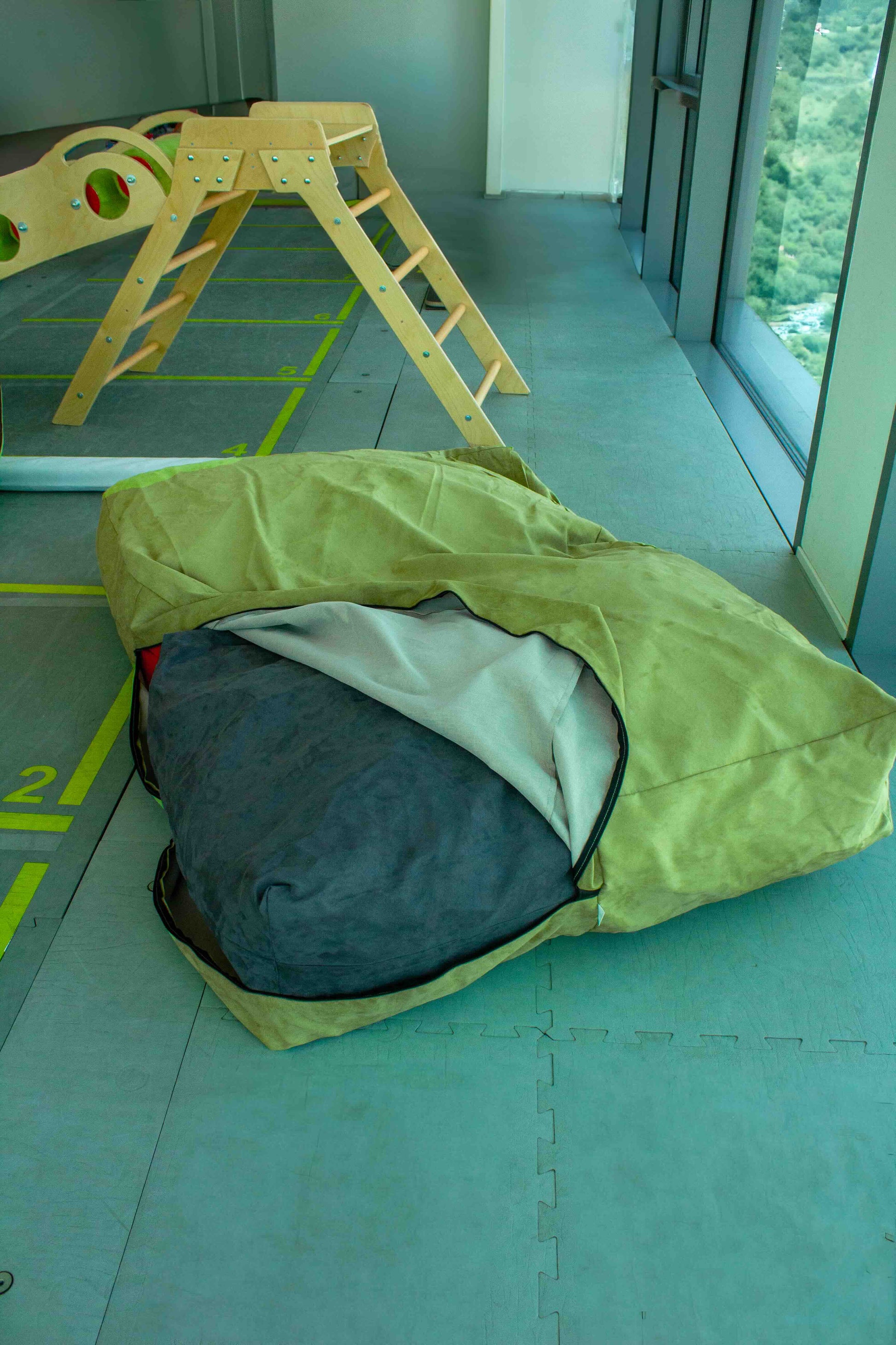 Die sensorische Matratze wurde sorgfältig entwickelt, um ein einzigartiges taktiles und sensorisches Erlebnis zu bieten. Dieses Matratzenset ist als große Matratze konzipiert, die im Inneren zwei separate kleinere Matratzen beherbergt, die jeweils mit unterschiedlichen Materialien gefüllt sind, um das Sinneserlebnis zu bereichern. Eine der Matratzen ist mit Schaumstoffstücken gepolstert, die bei der Herstellung hochwertiger Matratzen verwendet werden, während die zweite mit einer dichten Polsterung aus Polystyrolgranulat ausgestattet ist, wie es auch bei Ottomanen verwendet wird.