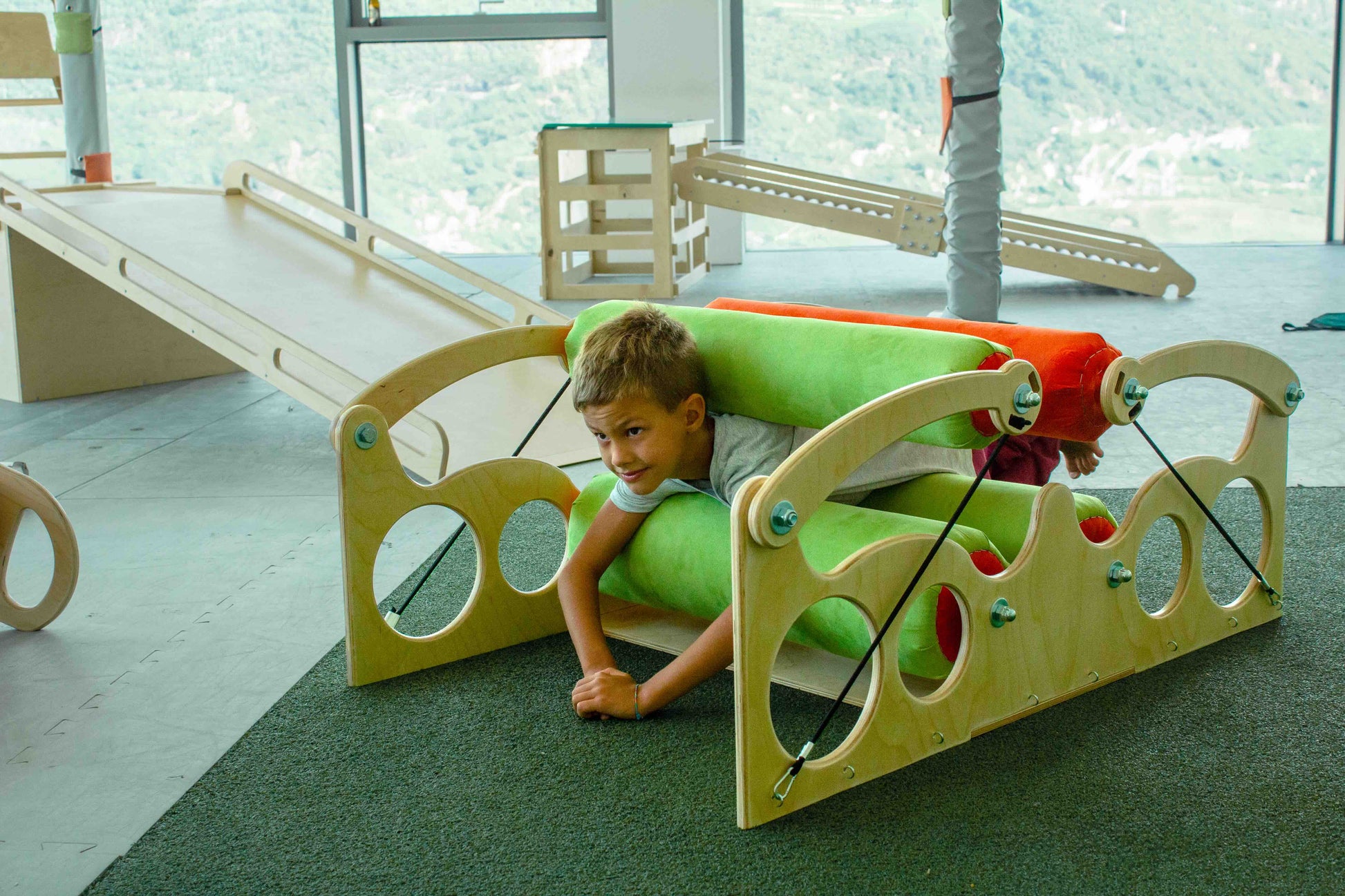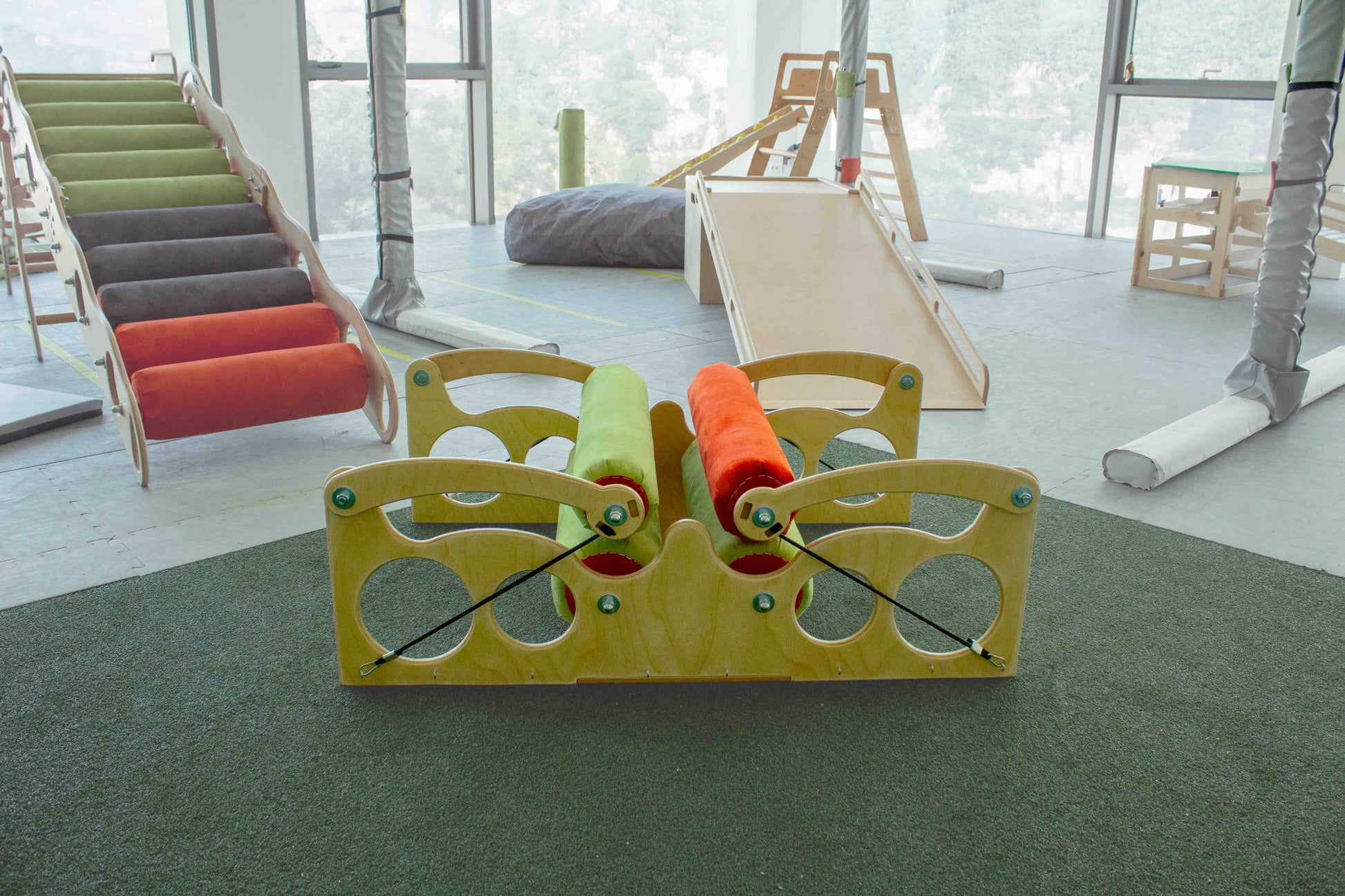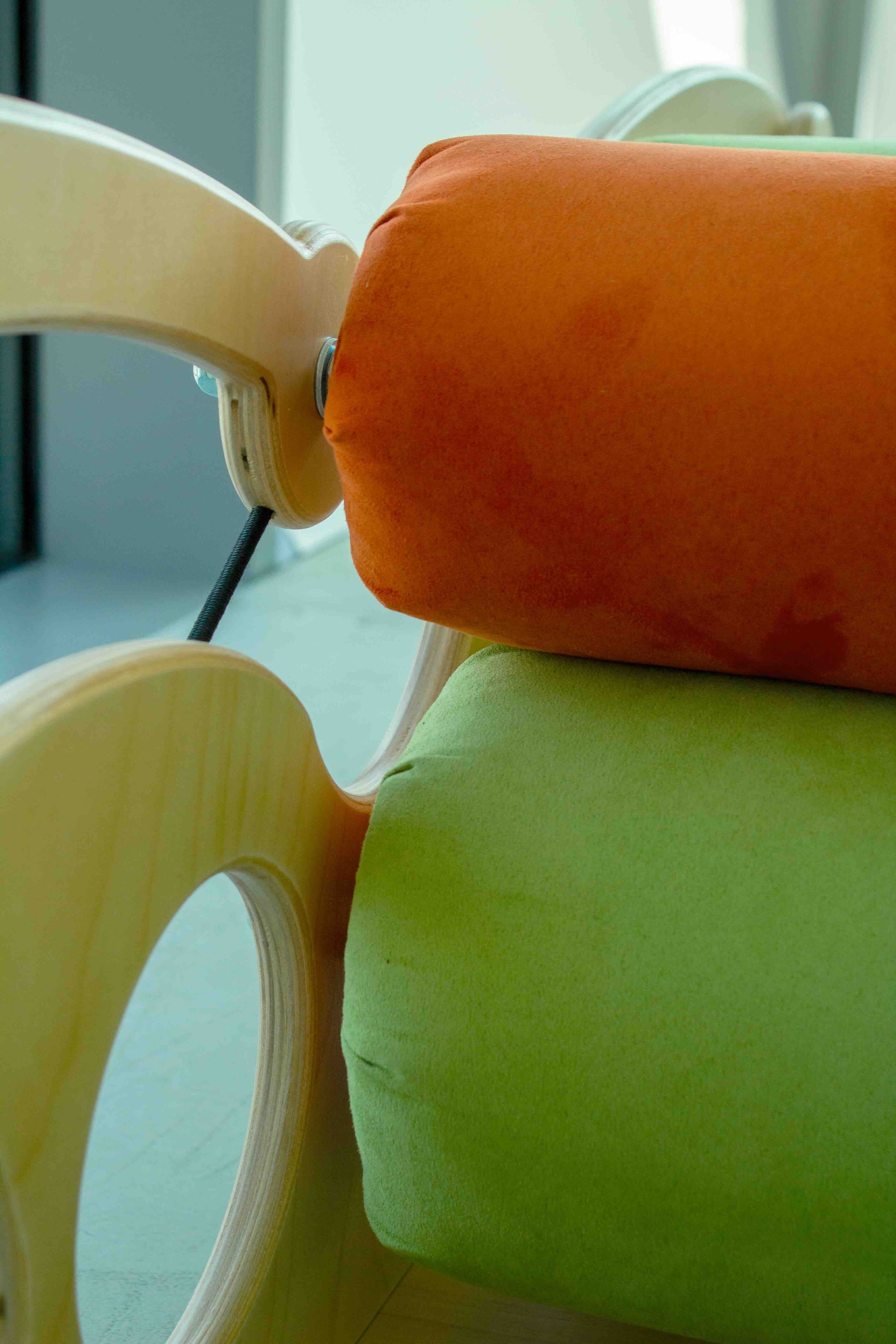 La Macchina degli Abbracci Piccola è caratterizzata da quattro rulli generosamente rivestiti in morbido tessuto, ciascuno avvolgente un cuore di soffice gommapiuma. La struttura, concepita in legno massiccio, offre solidità e affidabilità, garantendo una piacevole esperienza sensoriale.