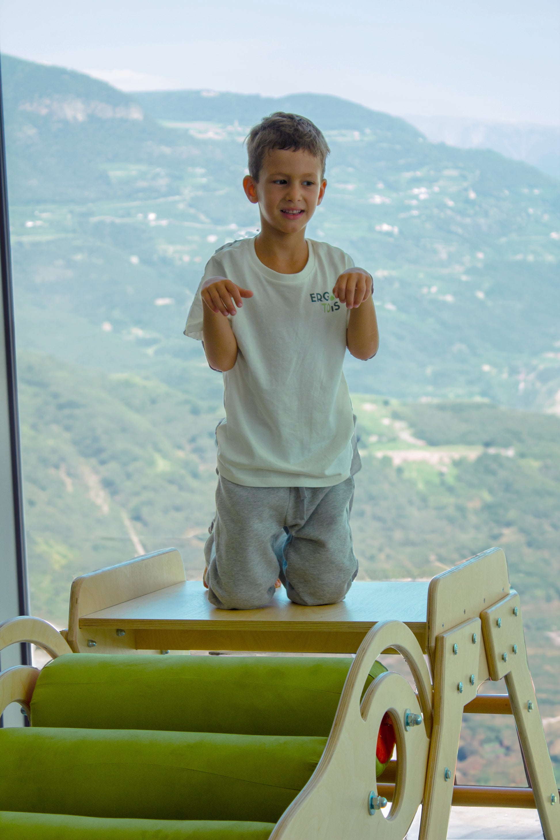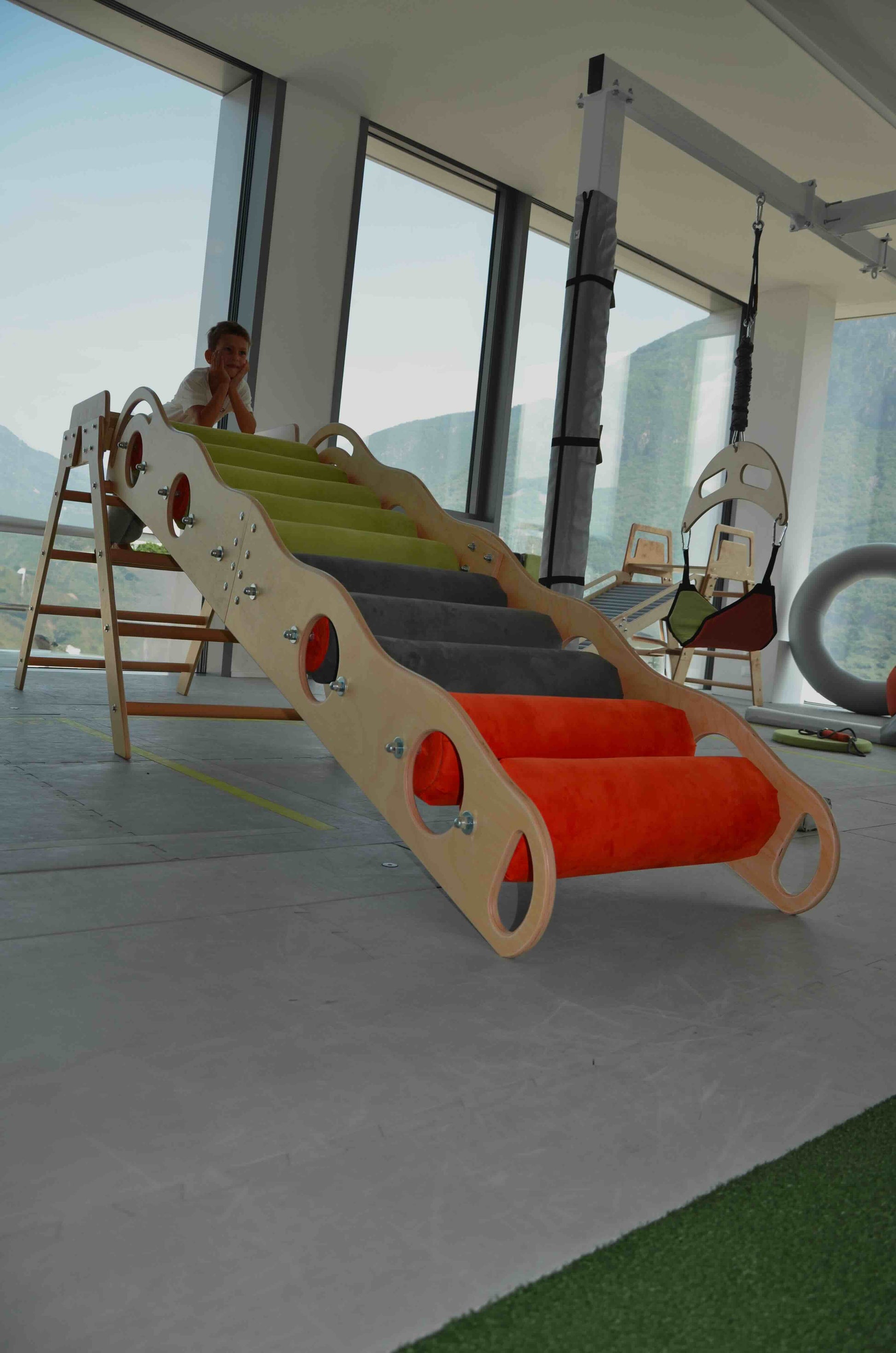 Interconnessi da eleganti pannelli laterali in legno, gli elementi sensoriali di questo scivolo sono progettati per coinvolgere attivamente la persona durante il percorso terapeutico. La rampa è abilmente collegata a una scala a ponte con 4 pioli, offrendo la possibilità di regolare l'altezza per personalizzare la sfida e adattarsi alle esigenze specifiche del cliente.