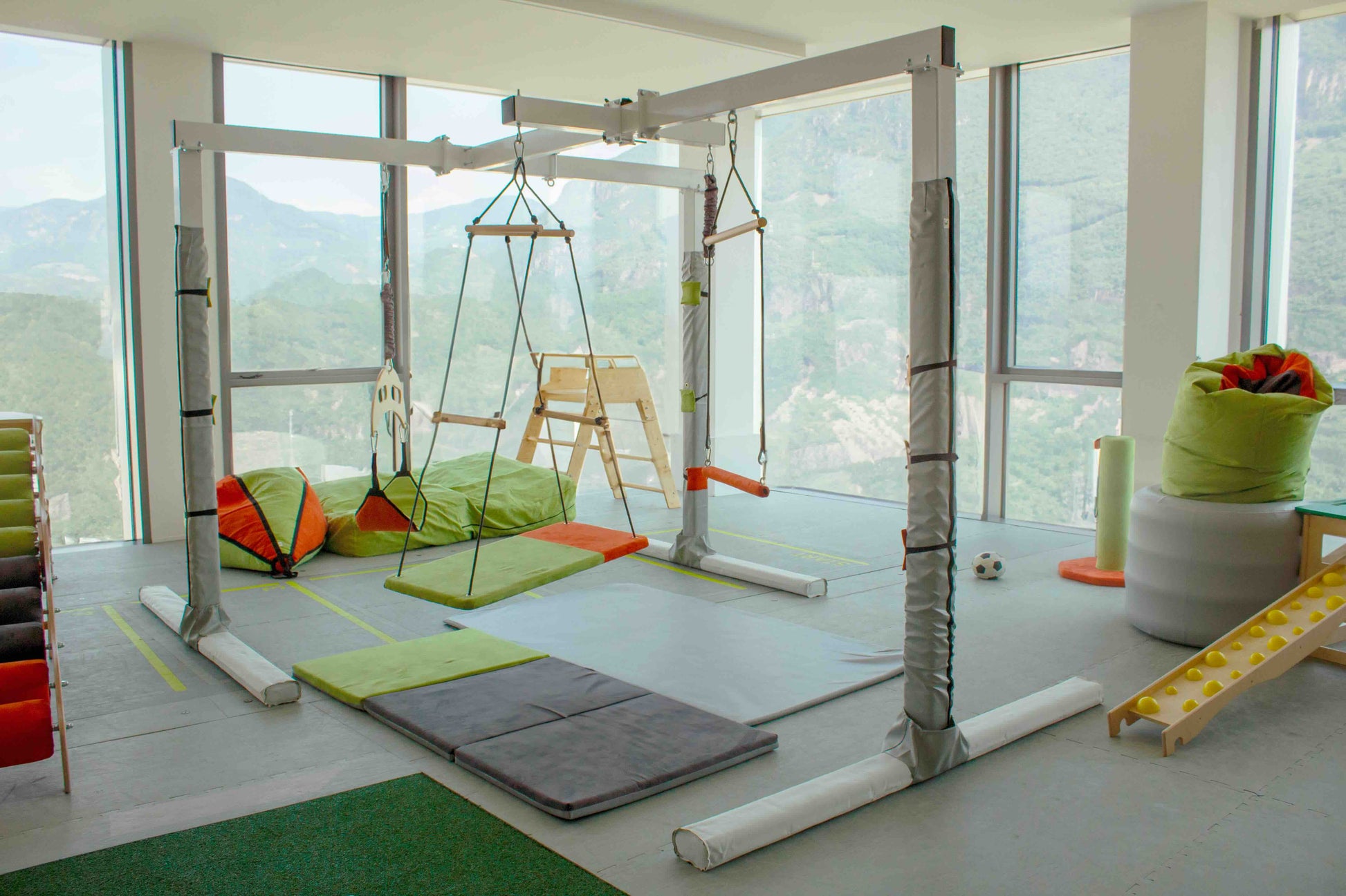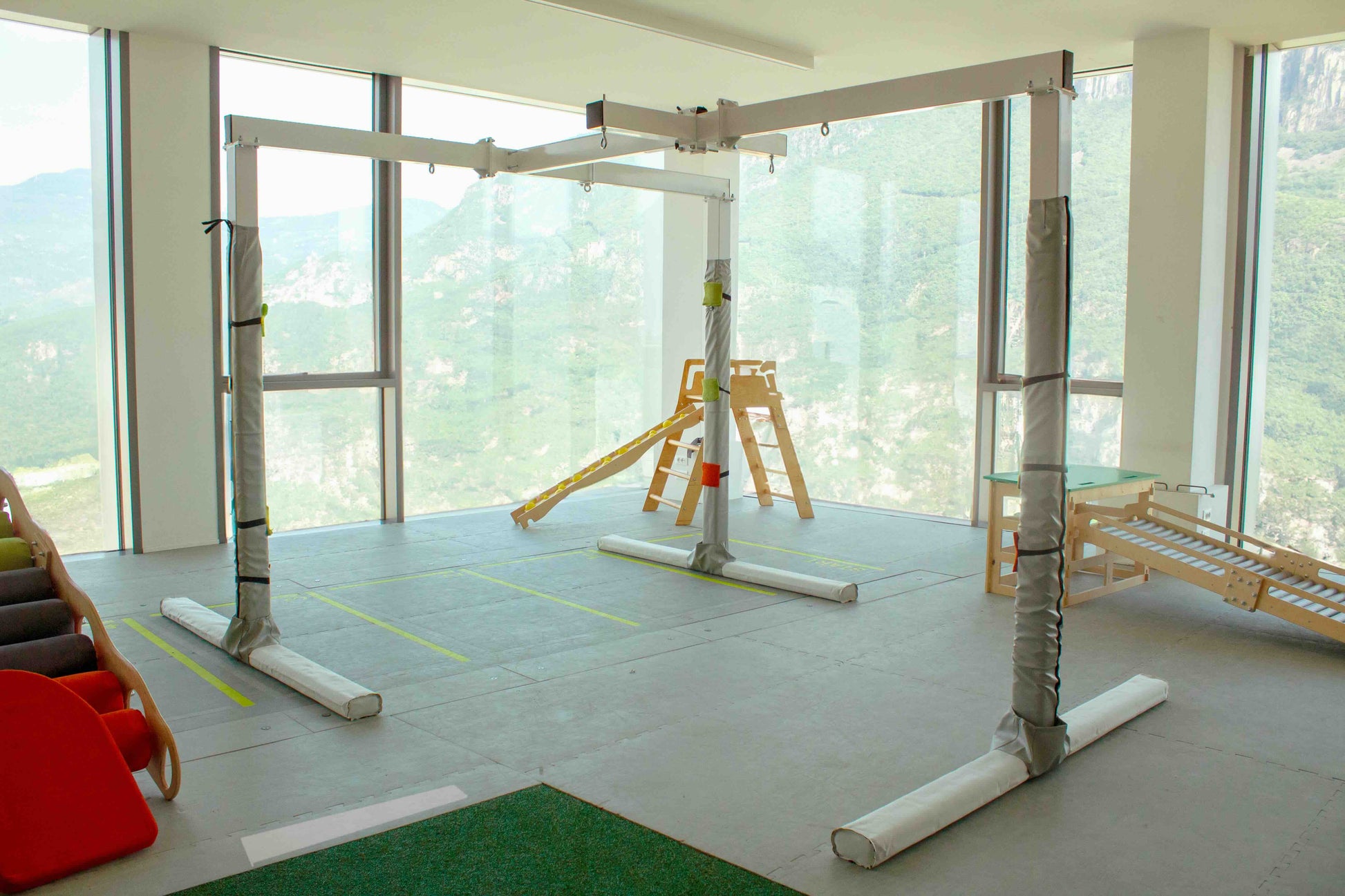 La parte superiore della struttura è dotata di numerosi ganci su assi orizzontali, offrendo una vasta gamma di opzioni per l'aggancio di altalene. Questa caratteristica consente di creare configurazioni personalizzate, permettendo l'aggancio di altalene a uno, due o quattro punti, rendendo la struttura particolarmente flessibile per adattarsi alle diverse esigenze terapeutiche.